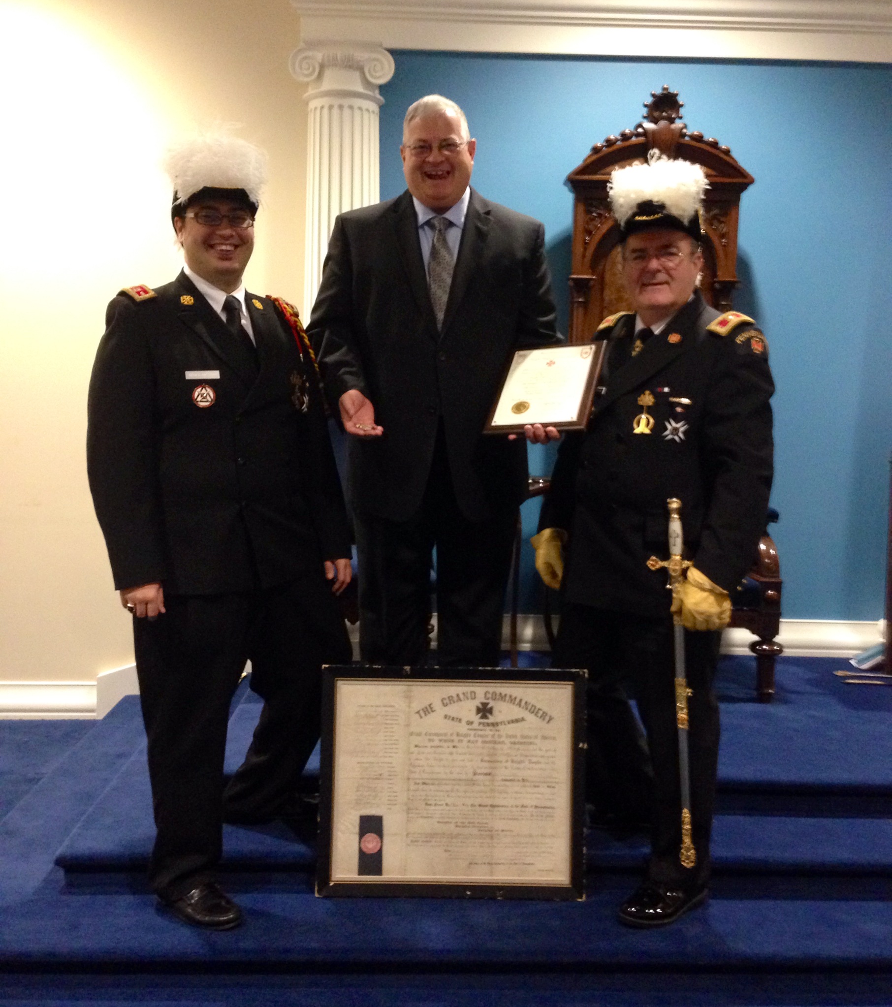 The award was presented by Sir Knight George H. Taylor, Eminent Grand Captain General of the Grand Commandery of Knights Templar of Pennsylvania (right), and Sir Knight Seth C. Anthony, Division Commander for Division No. 5 (left).
