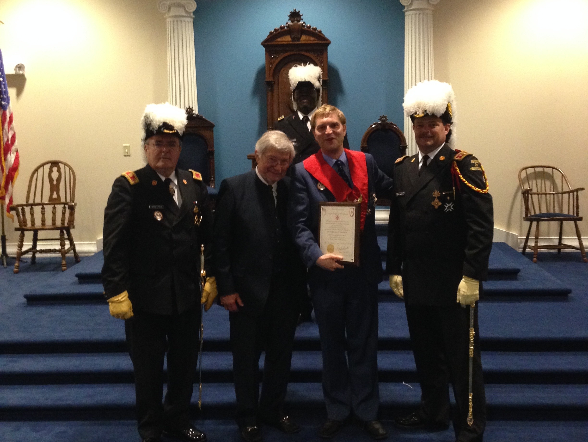 pictured above from left to right are SK George H. Taylor, Eminent Grand Generalissimo; SK John E. Von Blauch (John’s Father); SK John R Von Blauch IKT; SK Mark G. Mattern, Division Commander; (back) SK Gerald B. Stephens, Commandery Hermit Commandery.